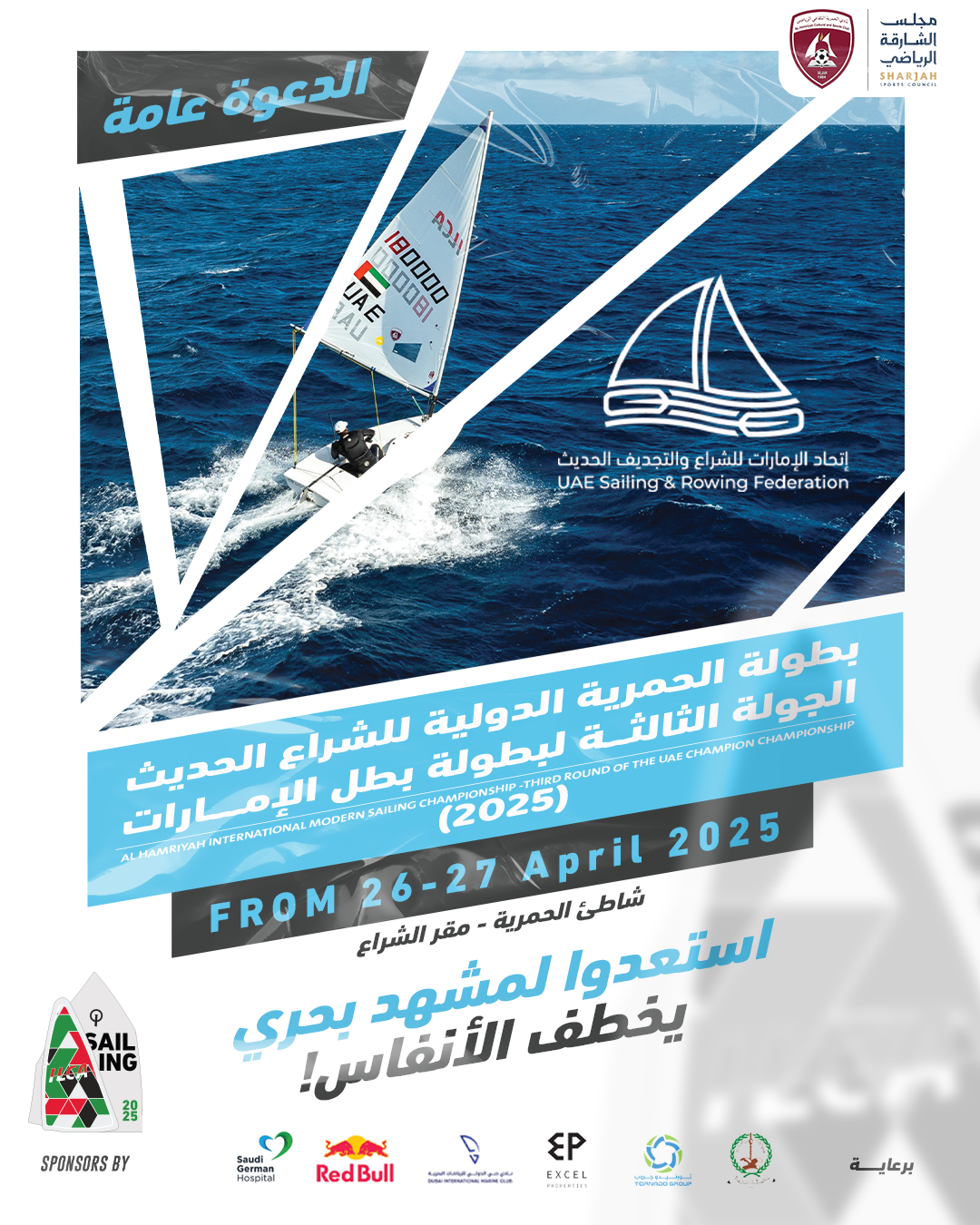 ينظم نادي الحمرية الثقافي الرياضي، في 26 و27 أبريل 2025، “بطولة الحمرية الدولية للشراع”، ضِمن استضافته للجولة الثالثة من بطولة بطل الإمارات للإبحار الشراعي، تحت إشراف اتحاد الإمارات للشراع والتجديف الحديث.