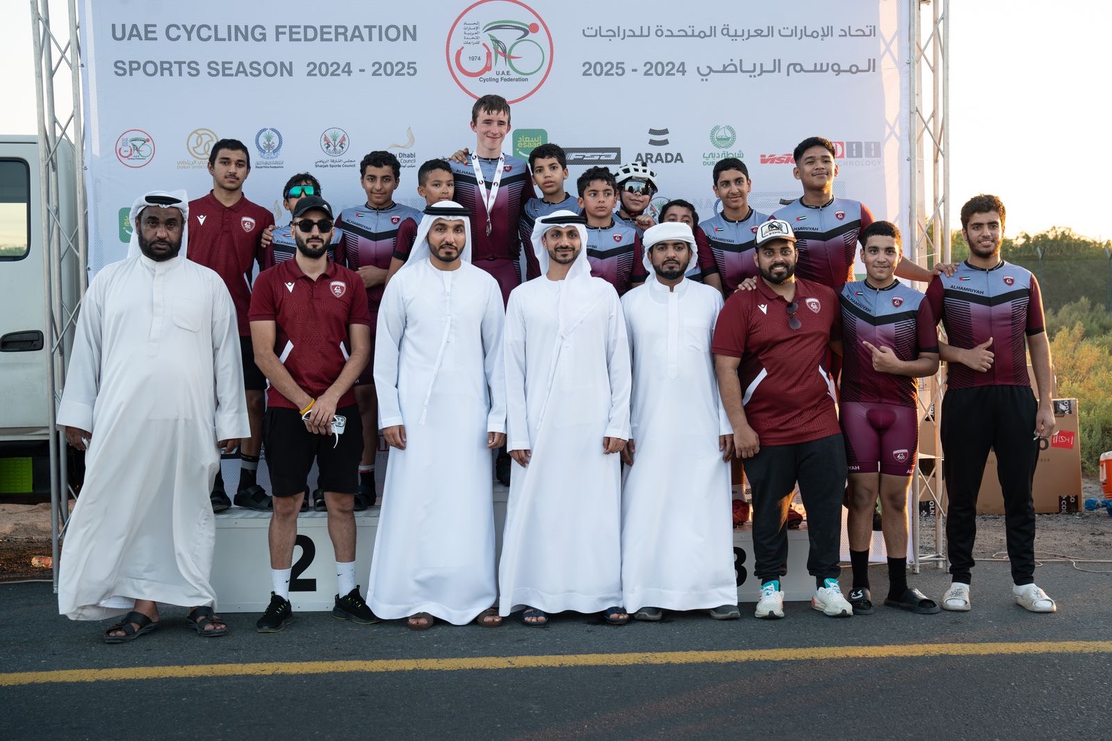 تقدم سعادة حميد الشامسي، رئيس مجلس إدارة نادي الحمرية الثقافي الرياضي، والدكتور ياسر الدوخي الأمين العام لاتحاد الدراجات، حضور السباق، وتتويج الفائزين.